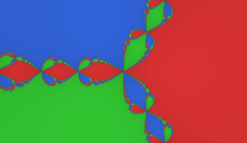 The boundaries of convergence regions have the property that between any two regions, the third region always exists (Wigner's property). This creates infinitely complex fractal boundaries where three-colored patterns continue no matter how far you zoom in.